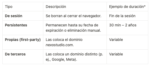 Funcionales – recuerdan preferencias (idioma, banner, etc.).